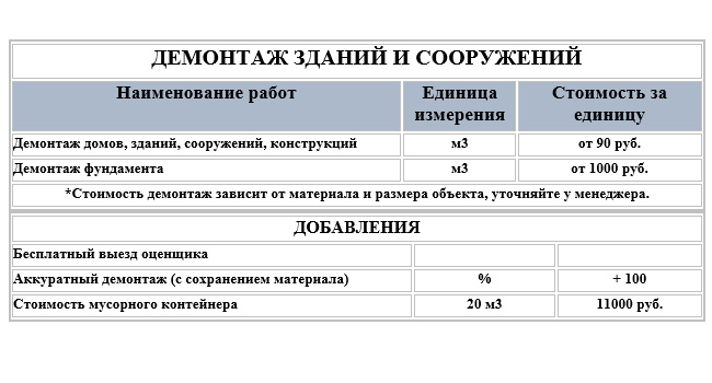 Чтобы оценить наиболее точную стоимость работ по демонтажу, необходимо подготовить подробное техническое задание. Если у Вас уже есть тех. задание, то пришлите его нам на почту.
